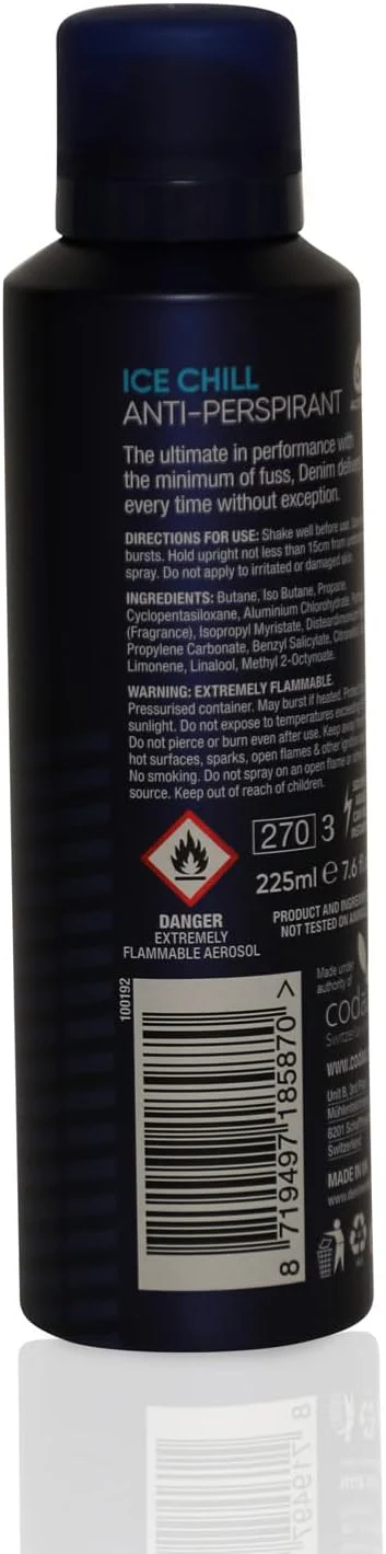 Denim Performance No Alcohol Long Lasting 24 Hour Fresh Anti-Persipirant with Fast Active ICE Chill Formula Body Deodorant Spray For Men - 225ML