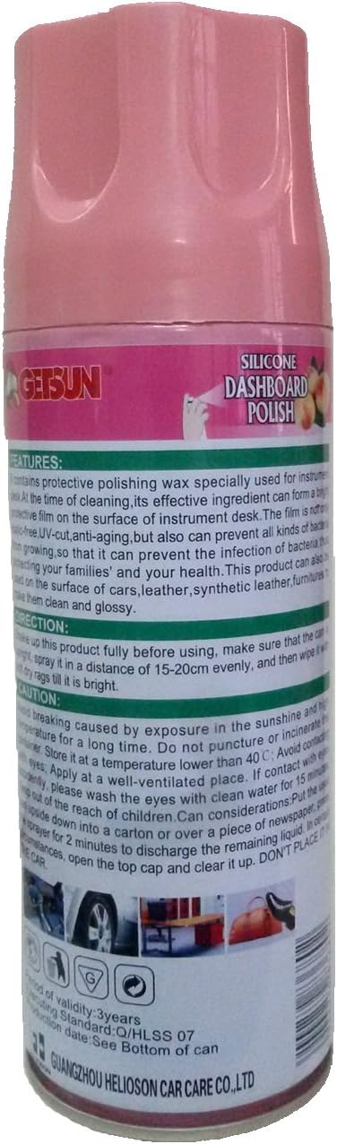 Getsun Silicone Dashboard Polish (450ml) cleans, shines, and protects your dashboard with an excellent gloss finish. Its peach fragrance leaves a fresh scent while providing long-lasting protection against dust and UV damage. Model: G-2006A.