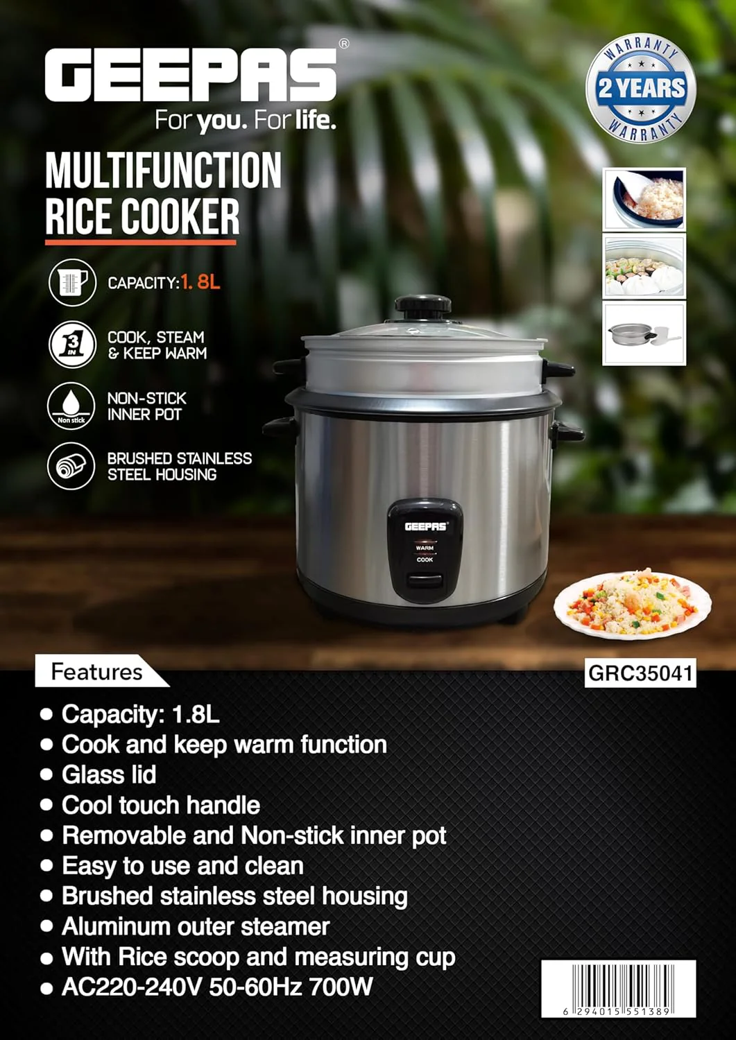 Geepas 1.8 L Multifunctional Rice Cooker- GRC35041| Durable Construction with Removable and Non-Stick Inner Pot with Cool Touch Handle|Aluminum Outer Steamer and Measuring Cup