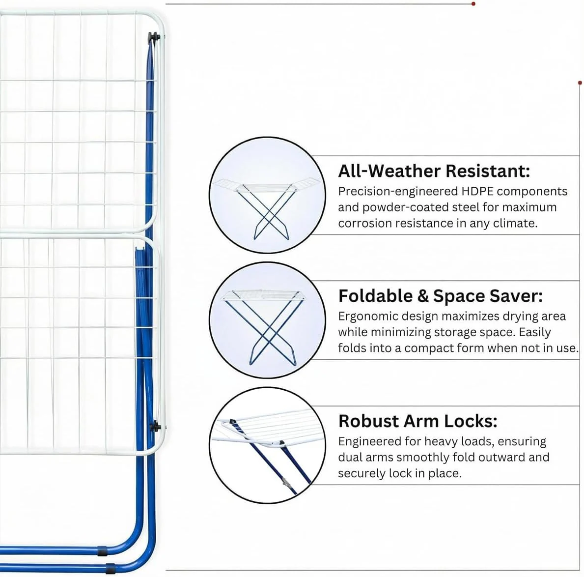 - Extendable Side Wings – Adjustable arms expand drying surface for bulkier items like trousers and sweaters
